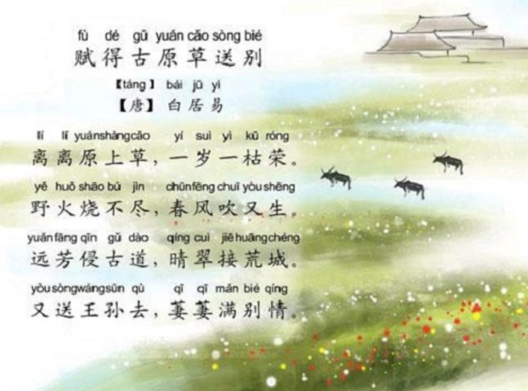 白话文释义:草原上的野草长得很旺,每年都会经历枯萎和繁荣的过程。野火也无法将它烧尽,春风一吹,它又生长了出来。芳香古老的道路上弥漫,阳光下,翠绿的野草通向那荒凉的城镇。又送走了亲密的好朋友,这离别之情如茂盛的野草,充塞胸怀。